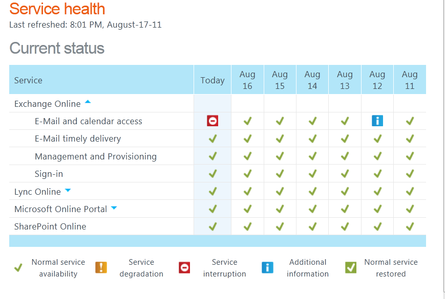 I logged onto the Office365 Portal Page (https://portal.microsoftonline.com) and clicked on Admin along the top. Along the left there is a Support link for Service Health. The Service Health screen gives the current status of all of the services, and the one-week history. The screen had a lot of green checkmarks, but under E-Mail and calendar access under Today was a red flag (seen below).