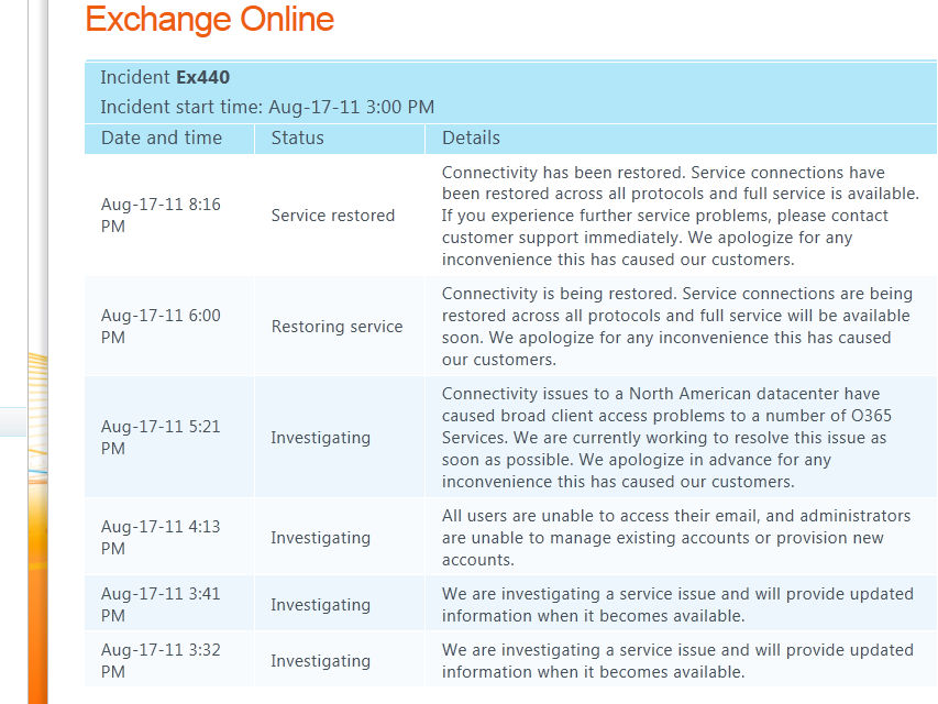 This afternoon my e-mail went down for a couple of hours. It is easy to detect if you are looking – the indicator at the bottom of the Microsoft Outlook client changed from Connected to Microsoft Exchange to Disconnected. I tried to connect to the Outlook Web Access site, but got a 503 Error.