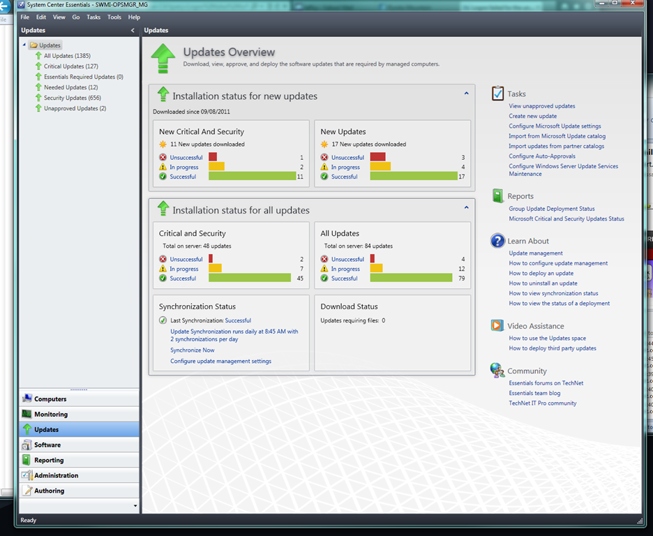While Microsoft offers Windows Server Update Services (WSUS) for free to manage patching in the organization, it is clear that System Center ConfigMgr does a much more comprehensive and manageable job of patching both servers and clients, with features such as a targeted and scheduled patching, as well as success, pending, and failure reporting of clients and servers. As you can see in the screenshot below, I can view quite clearly the patch level of my entire organization in the Updates Overview panel of SCE; additionally, I have along the right-hand side a hot-list of actions that can be taken, including such helpful links as Video Assistance and Community Links that will hold my hand through the learning process. As I tell all of my audiences, it is a rare case indeed when any of us are the first to encounter an error or issue in production software, and being able to reach out to the community – Microsoft MVPs and others who use the product – for help is the first step to resolving an issue.