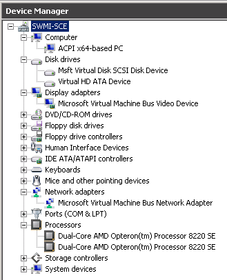 One primary difference between the Parent Partition and the Child partitions is seen in the following graphics. In the first graphic (Image1) we see the Device Manager for the Parent Partition. The expanded information is what you would expect – HP LOGICAL VOLUME denotes the HP RAID Array, the Display Adapter is ATI, there are two HP NC371i Multifunction Gigabit NICs, and the iLO Management Controller driver. The second graphic (Image2) is a similar screenshot from an operating system running in a Child Partition on the same physical box. It is the same ACPI x64-based PC… and it even has the same Dual-Core AMD Opteron™ Processor 8220 SE CPUs… it just has fewer of them (while Hyper-V allows us to assign up to four virtual CPUs to a VM, this one only has two). Where the Parent Partition has HP LOGICAN VOLUMES, ATI ES1000 video, and HP NC371i network adapters, the corresponding drivers for the Child Partition are MSFT Virtual Disk Devices, Microsoft Virtual Machine Bus Video Device, and Microsoft Virtual Machine Bus Network Adapters. While they have similar performance to the physical, the virtual partition has virtual hardware, unlike the para-virtual machine, which has physical hardware… sort of.