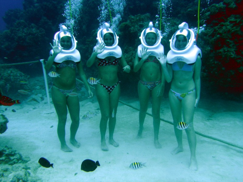 The picture below is of people far more attractive than our group (excepting my wife, who looks better than any of them in her bikini!) doing this activity, but as my camera is not waterproof (let alone at 30’) I had to take a stock photo from their website, and apologize for the theft… hopefully the huge thumbs-up I give them will appease them, and if you are in the Grand Cayman area check them out at http://www.seatrekcayman.com/.
