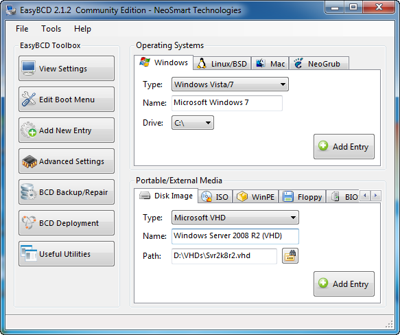 - In the lower half of the window there is the option to add a Portable/External Media entry to the BCD list. Ensure that Microsoft VHD is selected in the Type box.