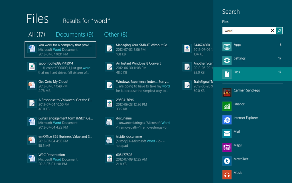 As you see the Search bar appears, and what you typed (in this case the word ‘word’) appears, and the Indexed Search starts just like it did in Windows 7… but cleaner! As you see, the Results pane shows all of the results, and the Search pane allows me to specify what I am searching for… Apps, Settings, or files.