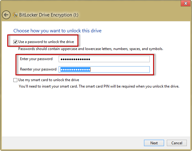 Once I click on ‘Turn on BitLocker’ (by individual drive or volume) it asks me how I want to unlock it – in this case I don’t have a smart card, so I select the password option.