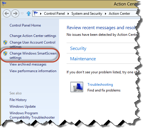 SmartScreen is even configured from the same screen as User Account Control… or at least you access the settings from the same Action Center screen. Notice that next to both ‘Change User Account Control settings’ and ‘Change Windows SmartScreen settings’ both have the little ‘shield’ icon next to them. That indicates that they are both protected by UAC, and that if you are not an administrator you will not be able to make changes to them. This is one more reason why you should not disable UAC… especially if you administer systems for others – even your family. Protecting your systems is easy, but it is a slippery slope to unsafe, and that slope is easy to avoid… but turning off UAC is akin to walking up to a cliff and tearing down the fence that prevents people from falling over.