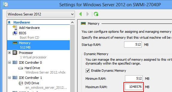 When you create a virtual machine there are a few defaults that Hyper-V thinks is a good idea… which I don’t. The main one that comes to mind is the Dynamic Memory option (per VM). When you configure Dynamic Memory the defaults are going to be:
