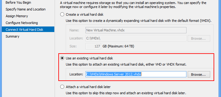 - From the New Virtual Machine Wizard click the radio button Use an existing virtual hard disk and point to the right file.
