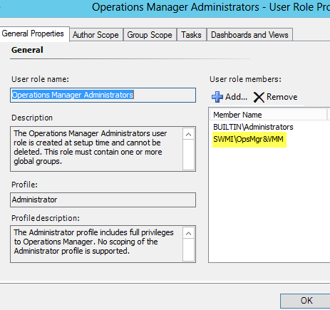 - In the User Roles main window double-click Profile: Administrator\Operations Manager Administrators.