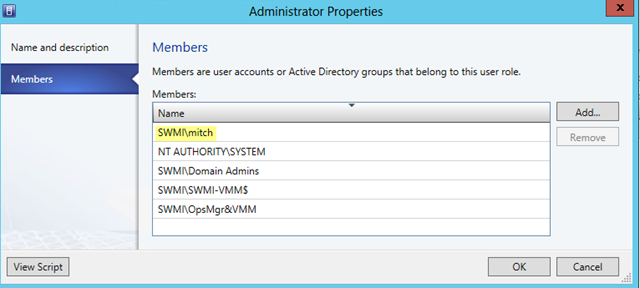 I am a strong believer in the old AGGUDLP philosophy – user Accounts go into Global Groups, which go into Universal Groups, which go into Domain Local Groups, which are then assigned permissions. As such I have created a Security Group in Active Directory called OpsMgr&VMM which I will assign to these roles.