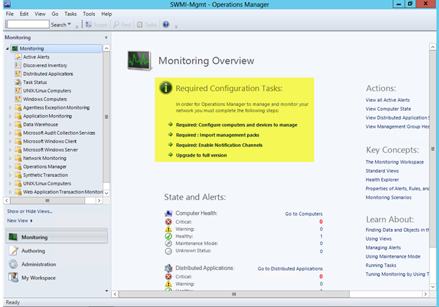 Notice in the middle you have the Required Configuration Tasks, of which four are listed. Each of these will open a wizard by clicking on them. While we are not covering these today, I do encourage you to start playing and who knows… before you know it you will be a veritable OpsMgr wiz!