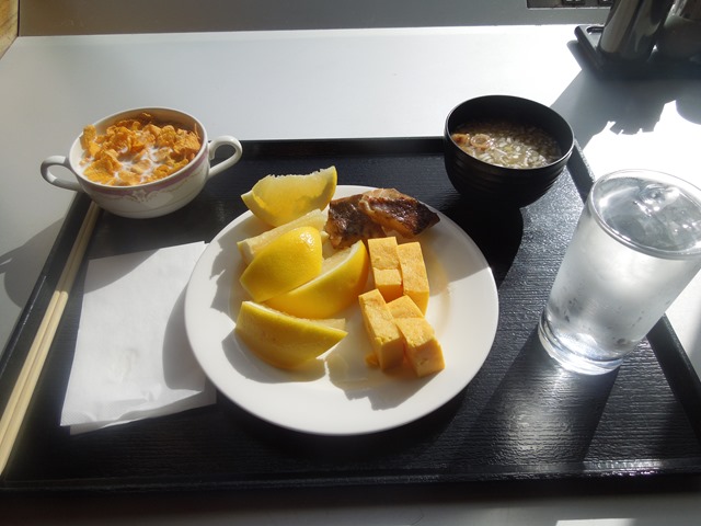 My hotel includes a buffet breakfast which in the past would have meant my gorging myself, but I am trying to change my habits so that is out. Yes, those are corn flakes in the top left corner, but add to that a bowl of miso soup, a couple of pieces of grilled fish (I am not quite sure what it was today… maybe mackerel), some Japanese omelet (tamago), and some grapefruit slices. You may have noticed the glass of water in place of either tea or coffee… I have not had a cup of coffee in nearly six weeks, and I am really trying to minimize my tea/caffeine intake. I am, however, trying to maximize my water intake, and this is a great opportunity to do so!