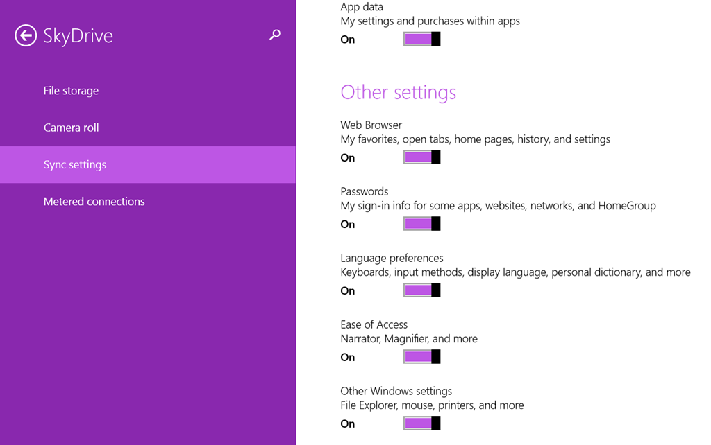 However let’s say we are no longer talking about the WiFi network of Arthur and Miriam Garvis. Let’s instead talk about a corporate environment where there is a policy to not save passwords. No problem… in the computer settings there is an entire section on SkyDrive, and within that there is an entire section on Sync Settings. Within that there is a section called Other settings in which you can very easily flick the Passwords option to Off. As with just about everything else in Windows, this can either be done as a one-off, or by Group Policy Settings across an Organizational Unit or Domain within Active Directory.