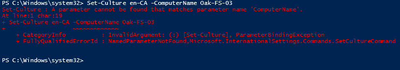 Invoke-Command –ComputerName Oak-FS-03 –ScriptBlock {Set-Culture en-ca}