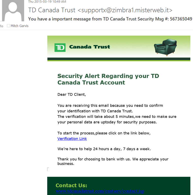 I do have a credit card with TD, and while I had not used it for several months, I did use it to pay for my parking this morning… the first time I used it in months. So while it might have been reasonable for them to contact me with a security issue, most phishing attempts are still pretty easy to detect… to someone who is looking for them.