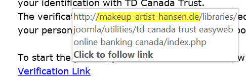 When I hovered over the Verification Link I got a completely ridiculous URL… what the heck would TD Canada Trust be using makeup-artist-hansen.de for? No way. And besides, let’s take a look at the original mail header again: