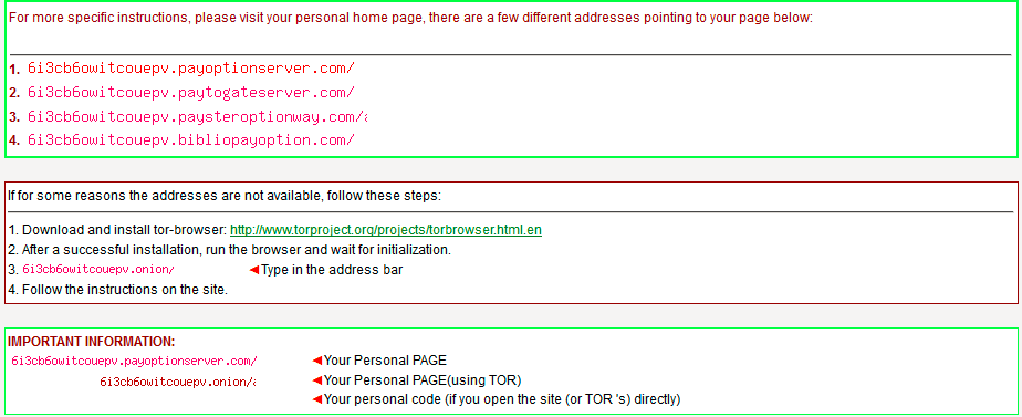 This is a screenshot of the bottom half of the message… the ‘how to conveniently pay us’ part of the ransom note. I have altered it so that the personal page of the actual victim is obfuscated, but otherwise this is what you would see.