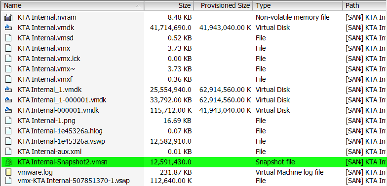 Did I forget to mention that while the Virtual Memory snapshot file is shown in Datastore Browser, the actual delta files are not (just like the Flat files are hidden). This is what we see when we connect to the host and look at what is going on under the hood.