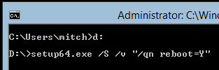 4. type in the following command line: setup64.exe /S /v “/qn reboot=Y”