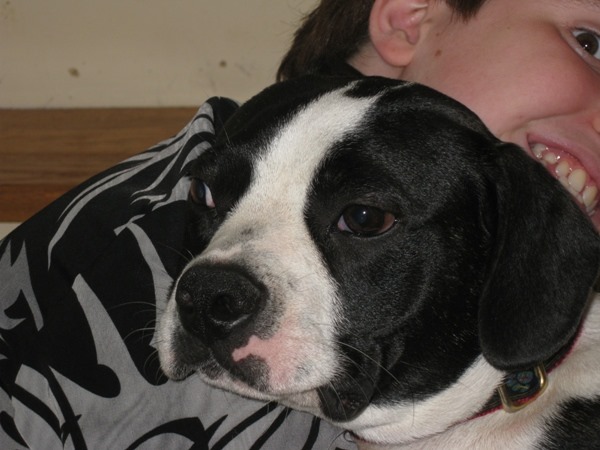 Saturday morning I drove to Oakville to collect them, and realized I had not written down the addresses of any of the dogs we were going to see. I went down to her computer room and logged onto Craig’s List. The first ad I clicked by accident because I had bookmarked all three that we were going to see… and I saw Jacob. Of course, Jacob wasn’t his name yet… He was just the oldest of a litter that was birthed on August 31 (which made him about seven weeks old). He was a Boston Terrier/Beagle cross, and he was the cutest ball of fur I had ever seen. ‘That’s my puppy!’