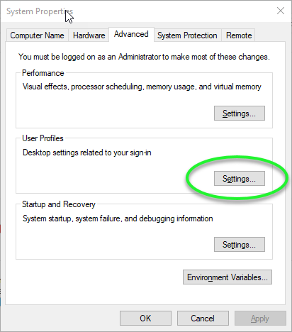3) In the Advanced tab of the System Properties window, in the User Profiles section, click Settings…