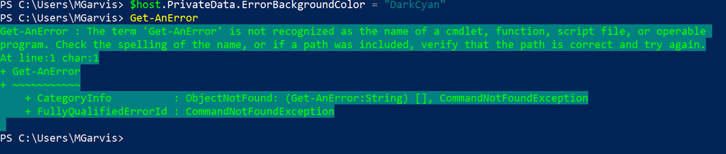 $host.PrivateData.ErrorBackgroundColor = “DarkCyan”