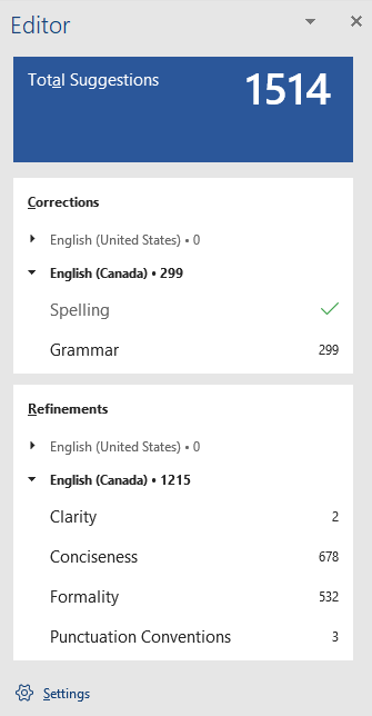 As you can see from the screenshot, Editor tells you how many suggestions it has to make, and then breaks them down into Corrections and Refinements. Within each, they are then further broken down by language.