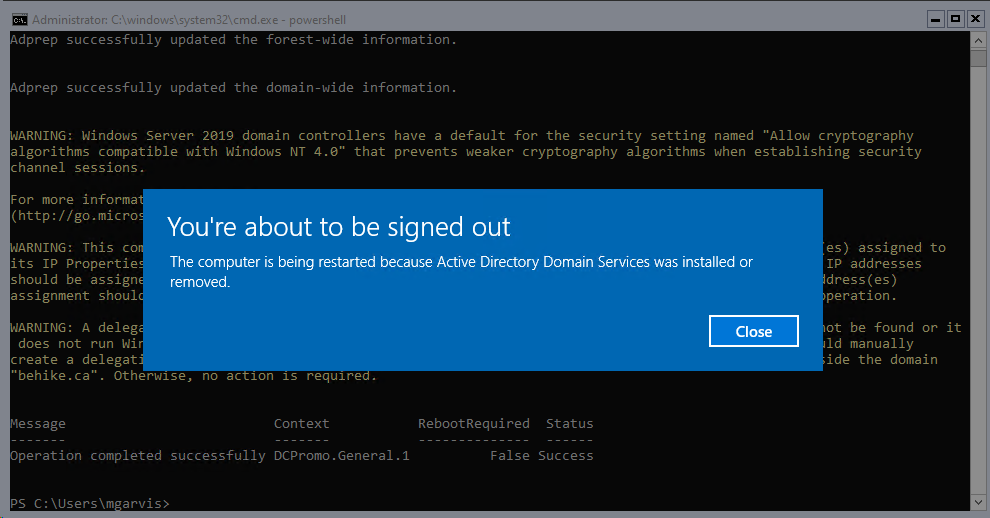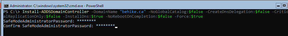Install-ADDSDomainController -DomainName “behike.ca” -NoGlobalCatalog:$false -CreateDnsDelegation:$false -CriticalReplicationOnly:$false -InstallDns:$true -NoRebootOnCompletion:$false -Force:$true