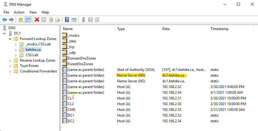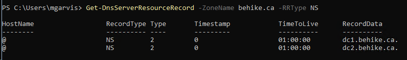 Get-DnsServerResourceRecord –ZoneName behike.ca –RRType NS