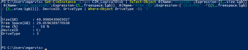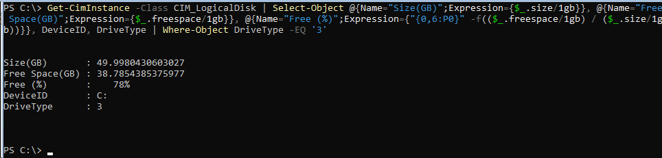 Get-CimInstance -Class CIM_LogicalDisk | Select-Object @{Name=”Size(GB)”;Expression={$_.size/1gb}}, @{Name=”Free Space(GB)”;Expression={$_.freespace/1gb}}, @{Name=”Free (%)”;Expression={“{0,6:P0}” -f(($_.freespace/1gb) / ($_.size/1gb))}}, DeviceID, DriveType | Where-Object DriveType -EQ ‘3’