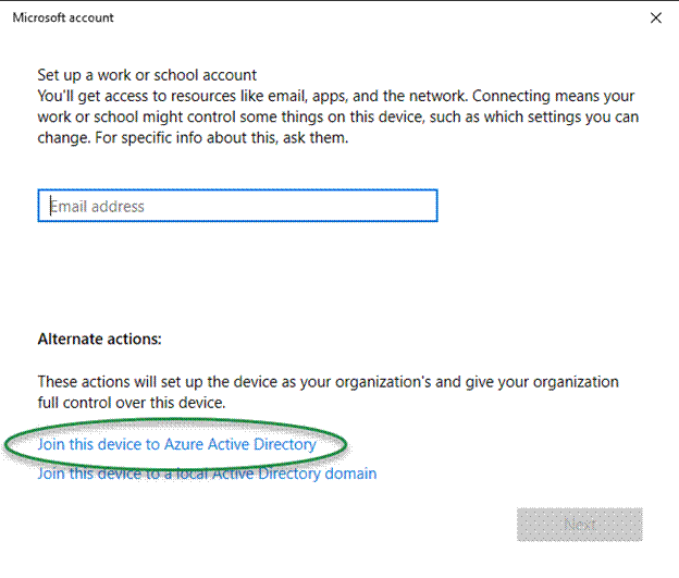 4) In the Microsoft account screen, click Join this device to Azure Active Directory.
