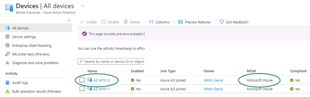 Our device is now AzureAD joined, and the MDM is Microsoft Intune. However, if you still have your doubts, you can also jump over to your Intune (MEM) portal and see this: