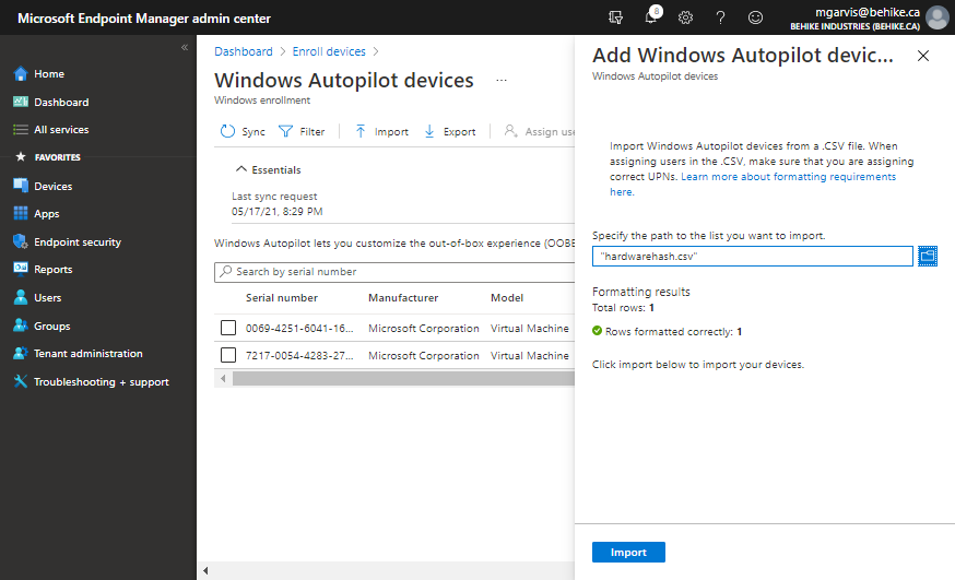 - In the Windows Autopilot devices screen, click Import in the top menu.