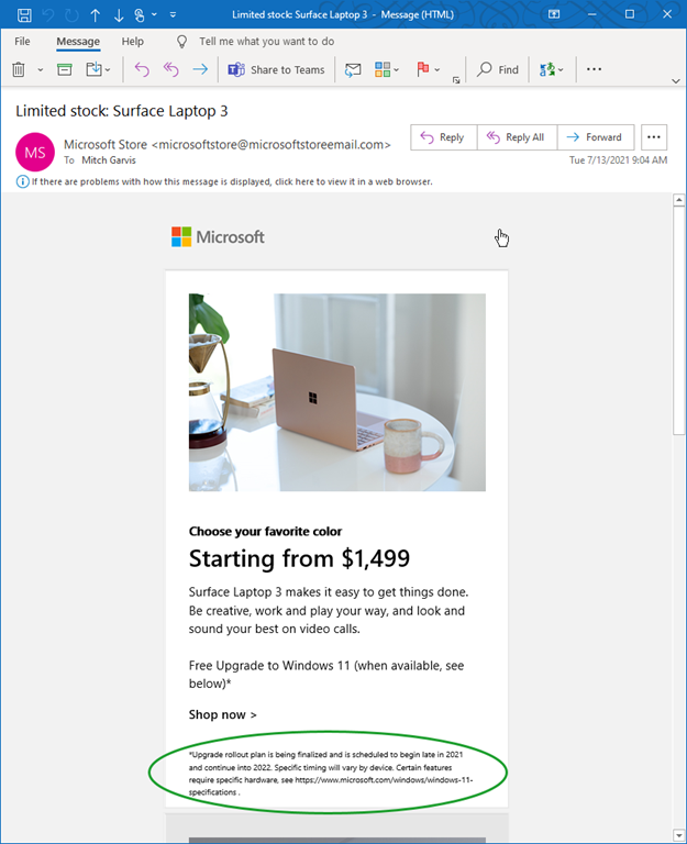 As you can see from the below unedited screen capture of the email, this is in a footnote to the claim: “Free Upgrade to Windows 11 (when available, see below).”