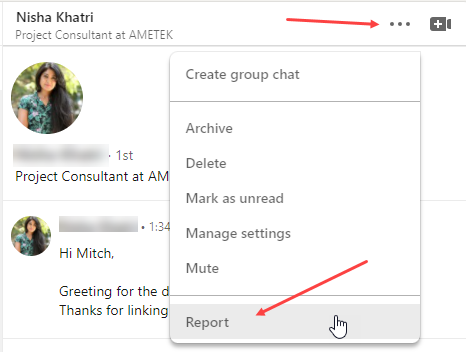 2) At the top of the conversation (next to the name) I click the ellipsis (…) and then click Report.
