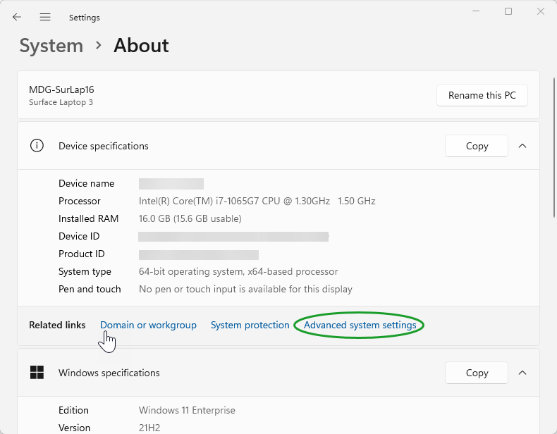 - Under the Device specifications there will be a series of Related links. Click Advanced system settings.
