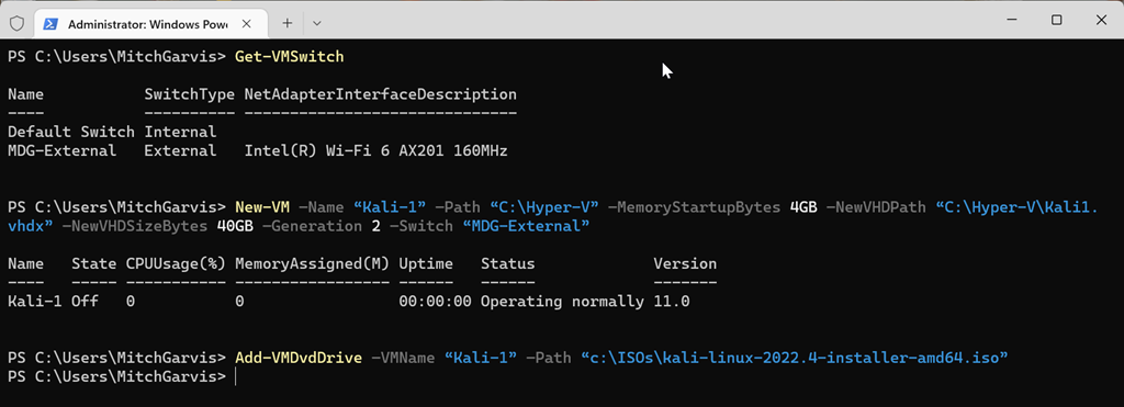 New-VM –Name “Kali-1” –Path “C:\Hyper-V” –MemoryStartupBytes 4GB –NewVHDPath “C:\Hyper-V\Kali-1.vhdx” –NewVHDSizeBytes 40GB –Generation 2 –Switch “MDG-External”