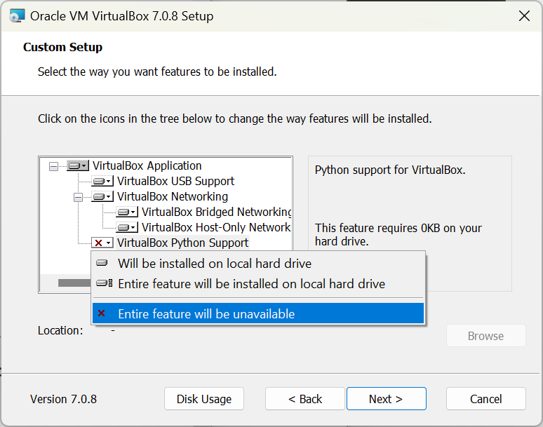 On this screen you can select to install all of the components, or pick and choose the ones that you want. A lot of people will install all of the components, but for our purposes we are going to choose to not install the VirtualBox Python Support so click on the box next to that and select Entire feature will be unavailable. You can also change the installation location if you want to. When you are ready, click Next >