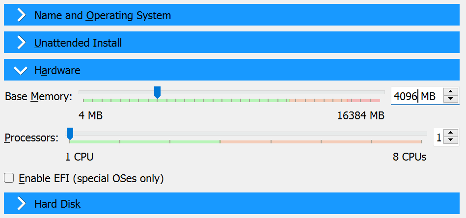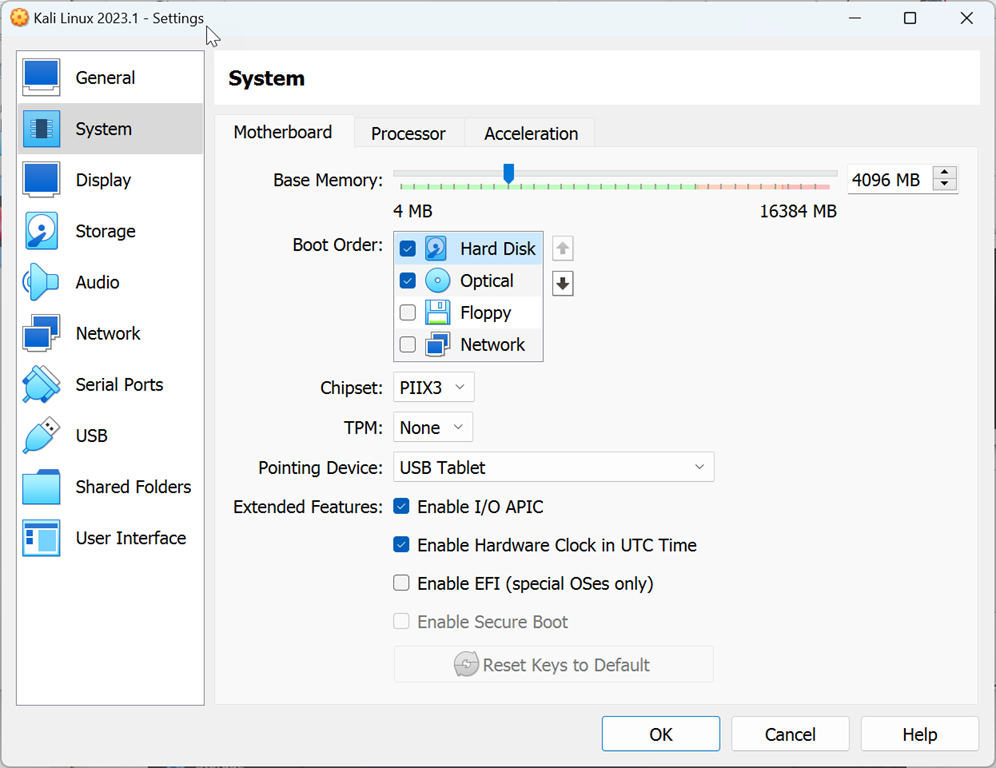 - Base Memory: 4096 MB (The default is 2048 MB but I like to give it a little more).