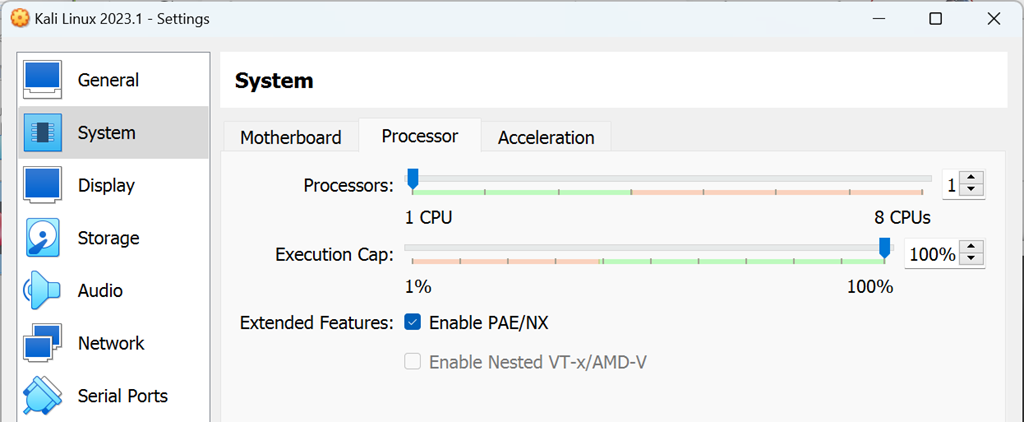 - Processor: 1 CPU (Kali does not need multiple processors).
