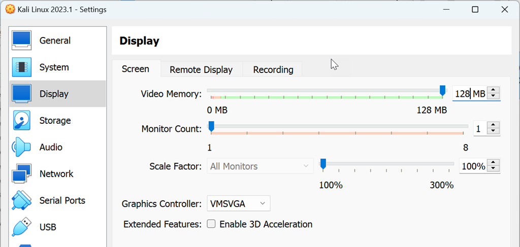 In the left navigation bar, select the Display blade. Adjust the Video Memory to 128 MB. As there is no need for it in Kali, make sure the checkbox next to Enable 3D Acceleration is deselected.