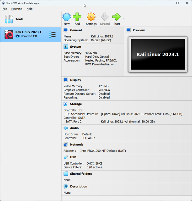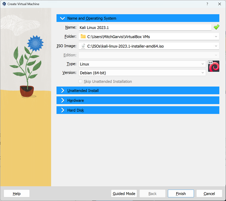 - Name: Kali Linux 2023.1 (you can name your VM however you like).