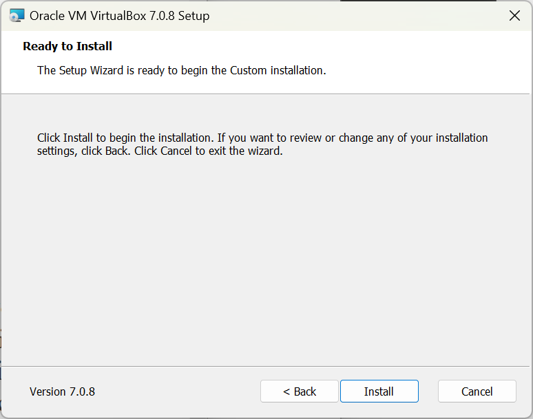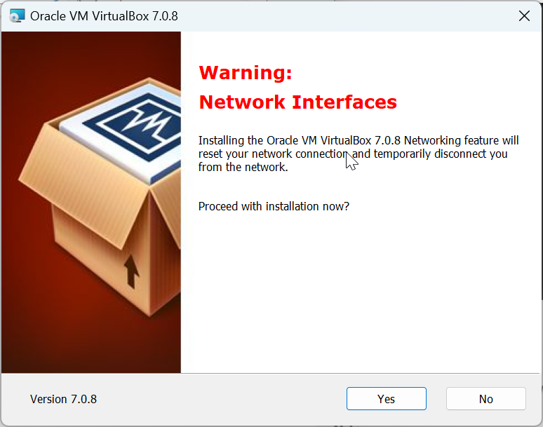 When we install our hypervisor it is going to take over your network interface card (to allow your virtual machines to connect to the network), and when it does, it resets the NIC for a moment. I have installed VirtualBox while attending online video meetings, and I hardly noticed a blip. If you are worried, make sure you are not doing anything that relies on persistent network connectivity while you install. Click Yes.