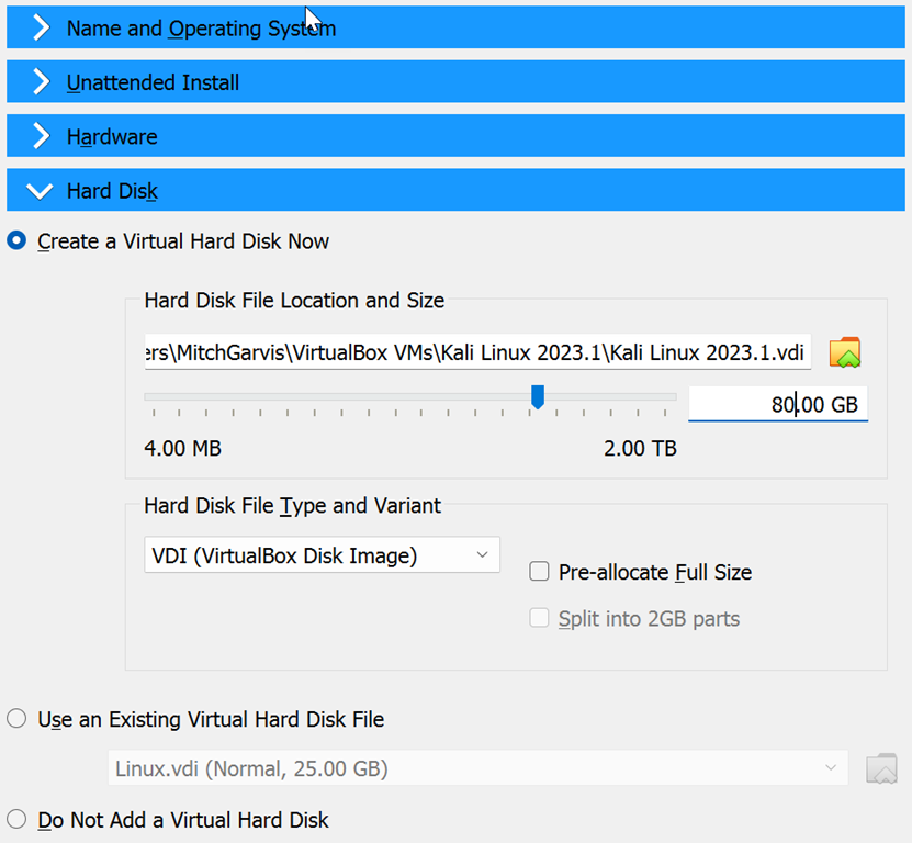 - Folder: C:\Users\MitchGarvis\VirtualBox VMs (feel free to change the location as you like, but this will be the default folder within your profile).