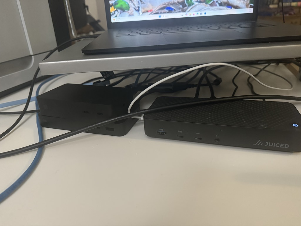 Let me share the secret of my vast expandability: when I am sitting at my desk at home with all of my devices connects I have three docks connected: One Microsoft Surface Dock 2 (which connects to the proprietary power port), one Microsoft Surface Thunderbolt 4 Dock (connected to the Thunderbolt port), and one third-party dock called the Juiced Systems Octone Dock (connected via USB-C to the Thunderbolt Dock). I could also connect it directly to the PC using the USB 3.1 port, but that’s another story.