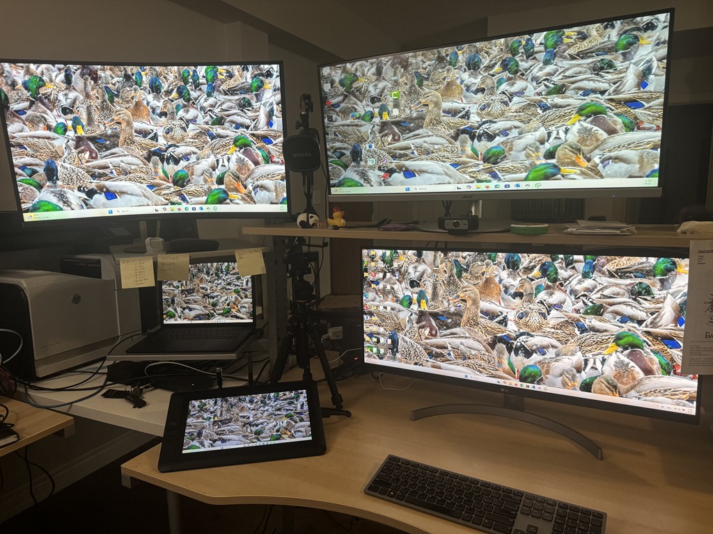 There are some caveats that I’ve encountered that I need to remember in order to run such a heavy load. My laptop’s USB ports only provide a small amount of power, and the docking stations (each of which could also provide power to the laptop) must be plugged into an external power source… and even that has caused me issues. When I started I was using an old power bar with plenty of plugs, but I am not sure that all of my devices were properly powered; I experienced a lot of off/on hiccoughs with it. Those were mostly resolved when I upgraded to a much better power bar (APC P11U2 Surge Protector with 11 power outlets and two USB ports, with a energy rating of 2880 Joules). I also have to be careful to divide the workload between the three docks… so two of my external monitors are connected to the Octane Dock, and the remaining two are connected by USB-C cable to the Surface Docks. Also, I make sure that the Digitizer’s USB connection and HDMI connection are connected trough the same dock.
