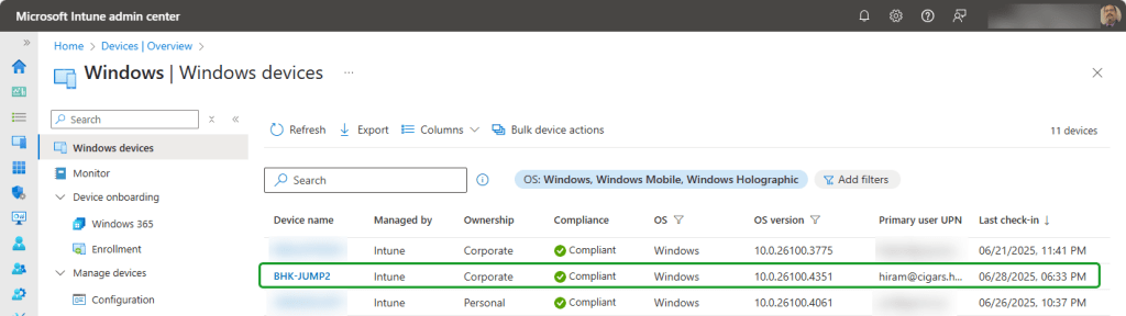 Once I ran that, it took only a few minutes for my machine to appear in my Intune. As shown: