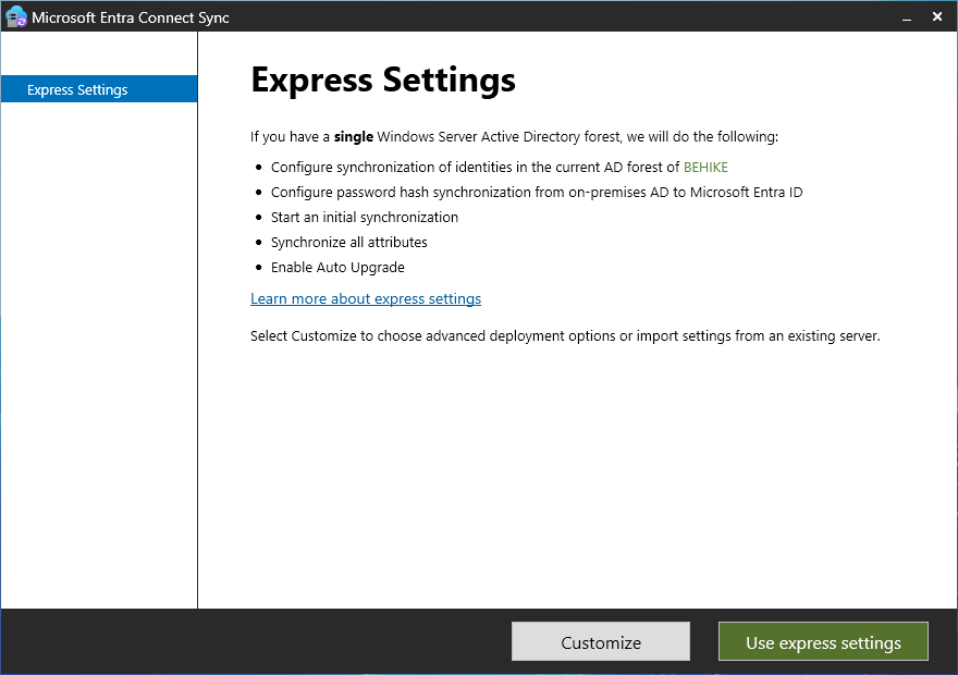 If you have a simple AD domain then the Express Settings will probably be simpler. On the Express Settings page you can click Use express settings… or you can click Customize. My domain is pretty simple so for the article we are going to use the express settings… even though I know there is an issue I will have to fix when we’re done.