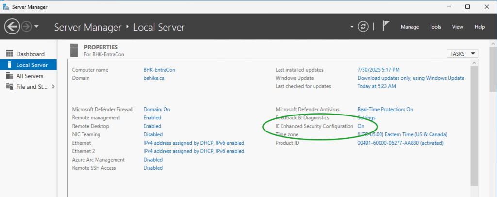 In order to bridge the two, we are going to use a tool called Entra Connect. For this we are going to create a machine running a supported edition of Windows Server. When I wrote my original article on the process I was using WIndows Server 2019; today I am using Windows Server 2025… despite some issues I have had with it in the past. It must be domain joined, While earlier versions may work, the recommendation is .NET v. 4.8 or later.