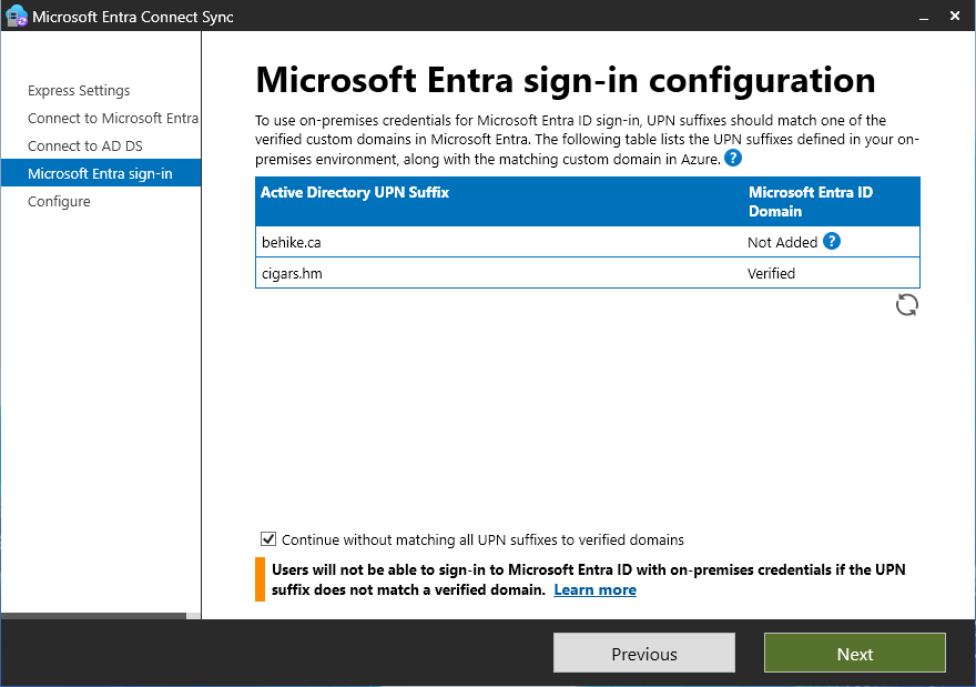 The next screen will be the Microsoft Entra sign-in configuration screen. If you are using a different domain name on prem as you are in the cloud then you will have to be careful here. I know, for example, that while my internal domain name is Behike.ca, I use that name in a different tenant that is not connected to my main Entra tenant… rather than taking that all apart, I decided to map my online users to a diffent domain name. In order to do that, without having to go back and reconfigure things manually, I decided first to add that UPN (User Principal Name) to my Active Directory, using the following PowerShell cmdlet: