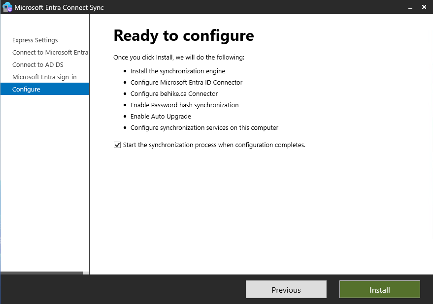 Once you get past here, the next screen will be Ready to configure. You will notice at the bottom of the list of what it is going to do, there is a checkbox that by default is checked that says Start the synchronization process when configuration completes. You can unselect it if you’d like, but I usually do not. Click install… and away we go!